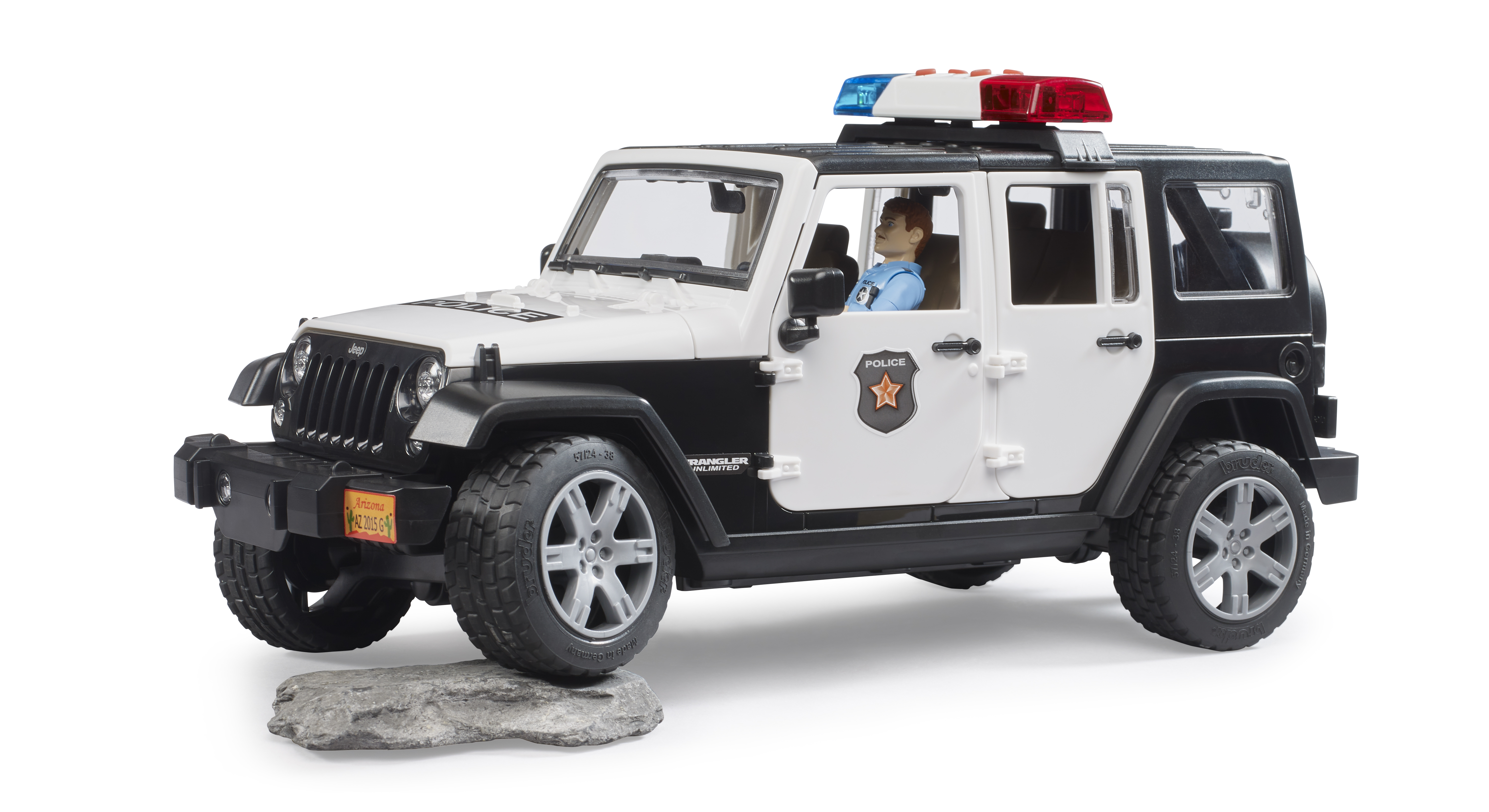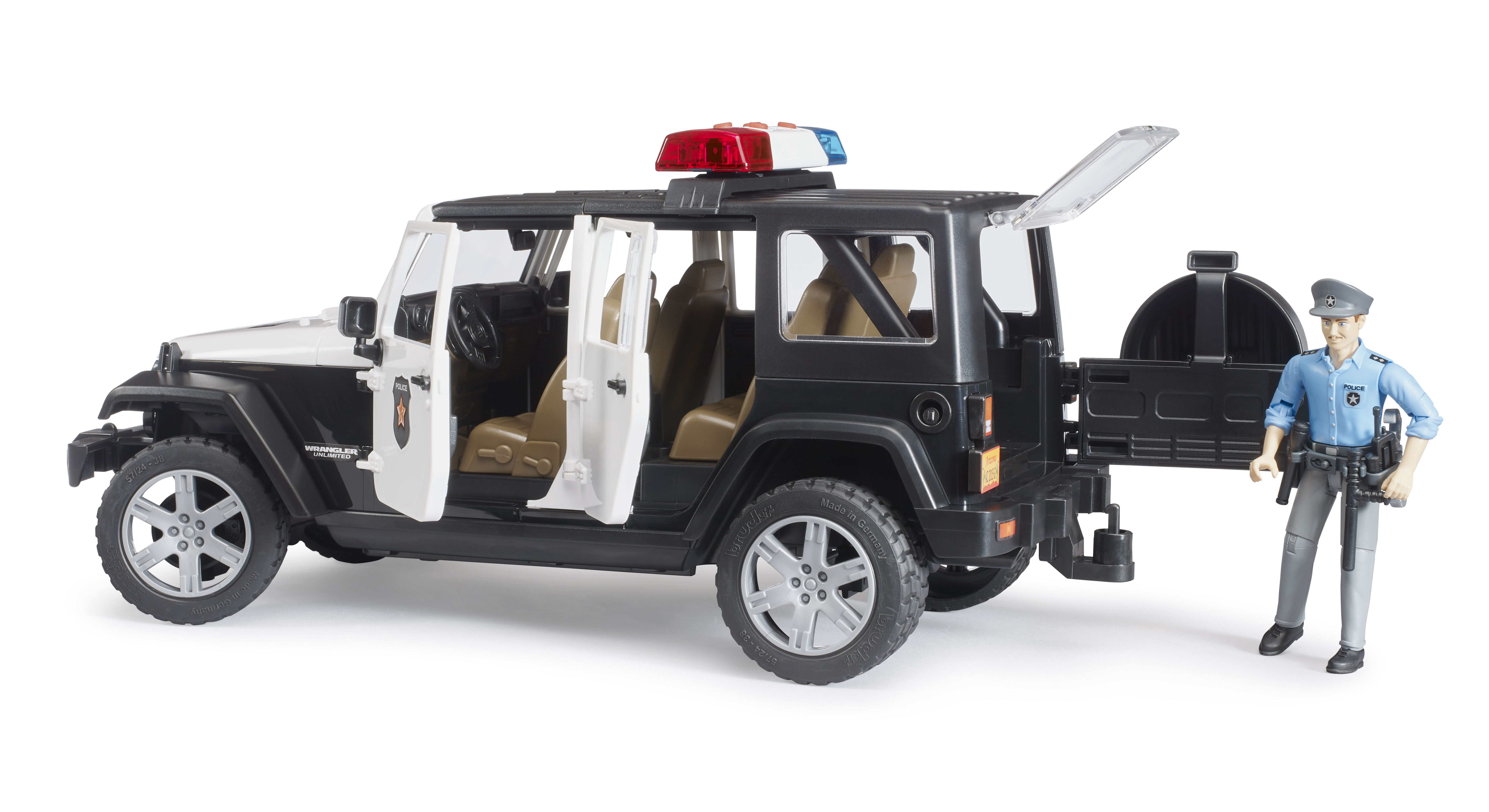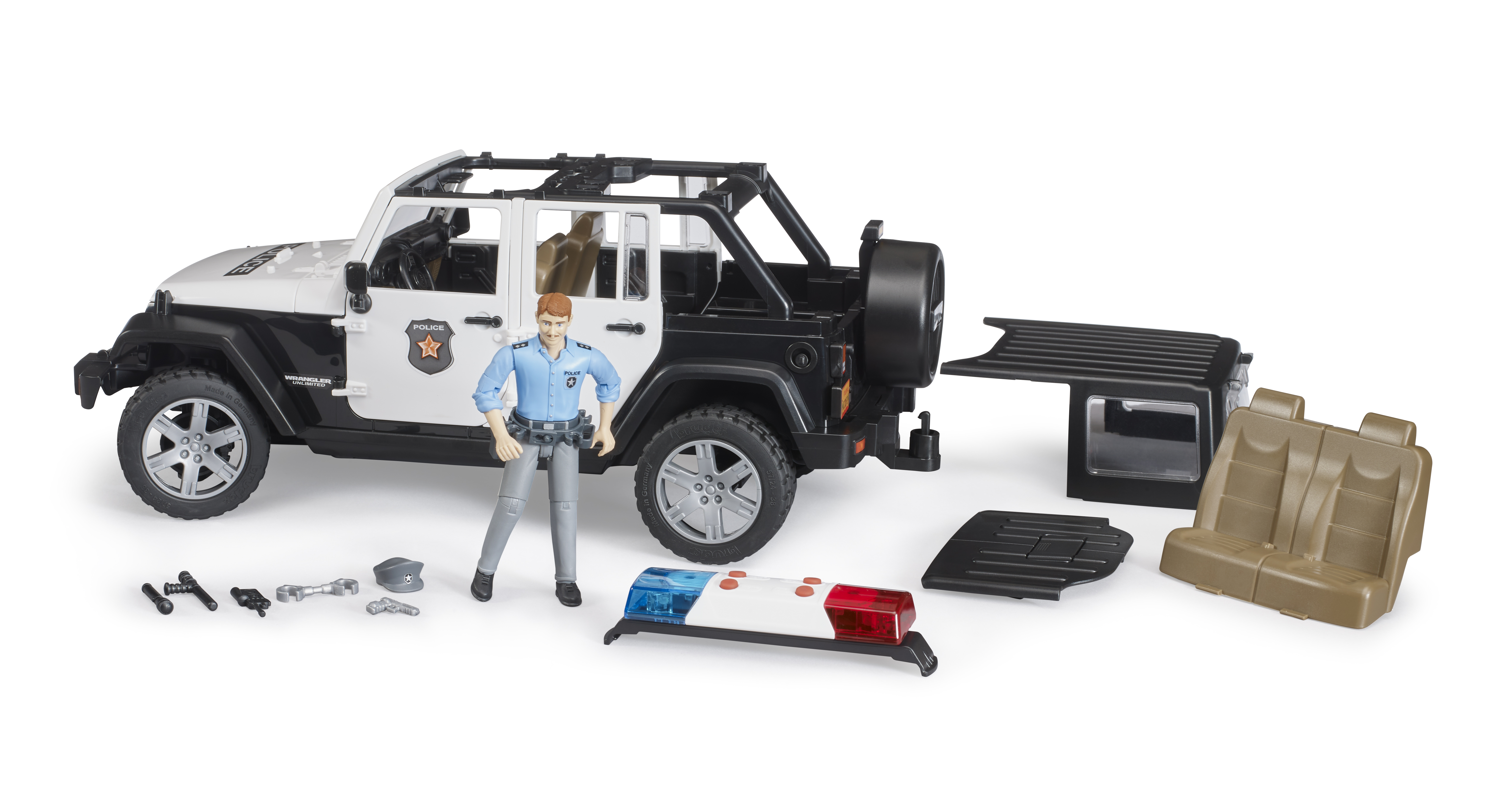 El Jeep Wrangler Unlimited Rubicon está diseñado para el servicio diario con un atrayente look policial e incorpora numerosas funciones que aseguran una diversión prácticamente ilimitada al jugar con él. Además del techo de segmentos extraíble de 2 piezas, es posible abrir el capó del motor, la puerta trasera y las otras cuatro puertas. Por supuesto, hay espacio disponible en el vehículo para que cuatro figuras bworld de BRUDER viajen juntas. Como alternativa a la ocupación total de los asientos se puede extraer el asiento trasero para poder alojar en el área de carga los accesorios de elementos de unión estándar de BRUDER. La barra de dirección adicional sirve para dirigir fácilmente el vehículo a través de la ventana de techo y se puede guardar en el suelo del vehículo si no está en uso. Los ejes tienen una suspensión todoterreno y los neumáticos perfilados tienen llantas con atractivo aspecto de vehículo deportivo. Gracias al punto de inserción frontal, en el que se puede sujetar por ejemplo el torno de cable, que se puede adquirir adicionalmente, y al acoplamiento de remolque extraíble, las posibilidades de ampliación en el mundo BRUDER no tienen límite. La versión policial del modelo Jeep dispone de un módulo de luces y sonido de nuevo diseño que está equipado con cuatro botones para activar funciones (1. Ruido de motor 2. Sirena de policía 3. Sirena de bomberos 4. Señal de emergencia). El policía bworld está totalmente equipado para resaltar su autoridad en todas sus acciones. El cinturón donde porta su pistola tiene también una linterna, un radio y una porra como equipamiento importante para el servicio.